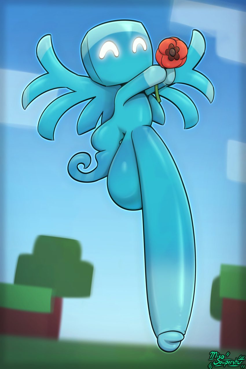 Allay Hentai Art – happy, white eyes, humanoid, small but hung, mouthless, blue wings, holding flower