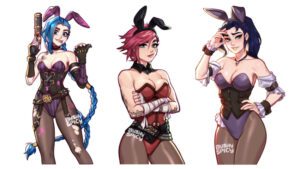 Jinx Porn Hentai – torn legwear, blushyspicy, riot games, cleavage, white background, bunnysuit