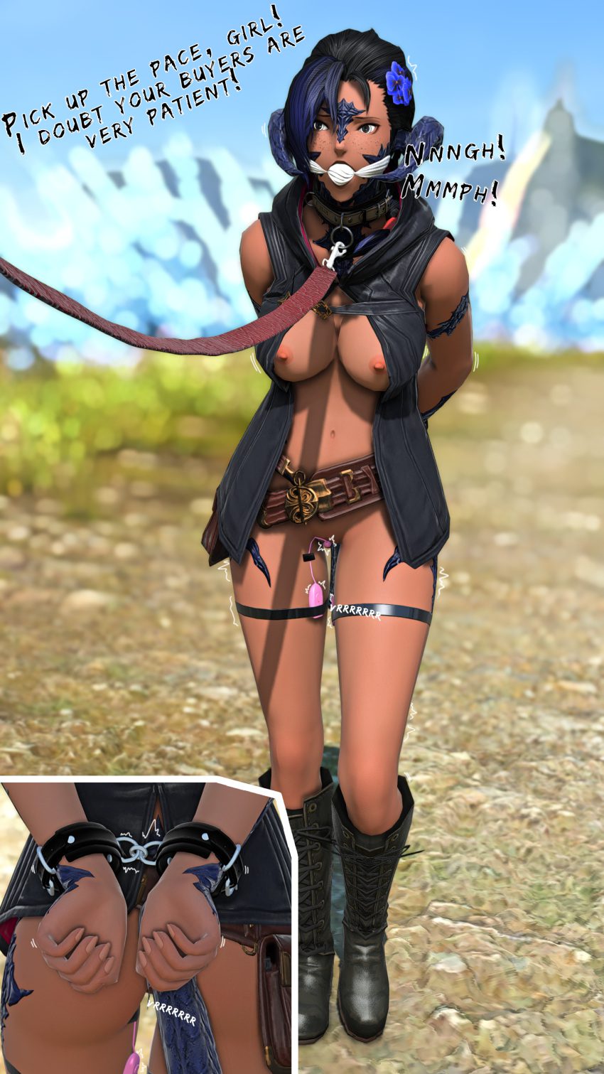 Final Fantasy Free Sex Art – au ra, exposed breasts, cuffs, leash, captured, struggling, collar