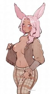 Final Fantasy Hentai Art – long hair, purple eyes, chadolbaegi, open jacket, no bra, flashing breasts, bunny girl