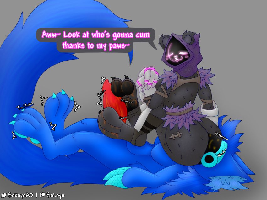 Fortnite Hentai – lying, twitching, onomatopoeia, hood up, blue fur, scar, facial scar