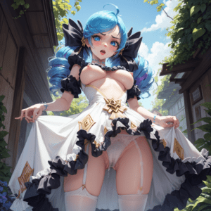 Gwen Sex Art – hair ornament, holding weapon, frilled dress, ai generated, angry, blue hair