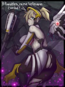 Overwatch Hentai – partially clothed, blue eyes, spanish text, big breasts, ripped pants, partially nude, semi nude
