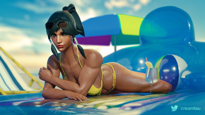 Overwatch Hentai Porn – medium breasts, bikini, beach, sunglasses on head, black hair.