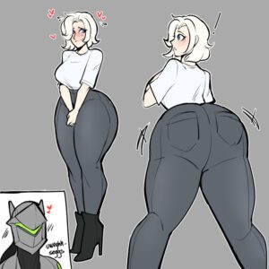 Overwatch Rule Xxx – hips, white hair, mercy, blender, crop top, shorts, breasts
