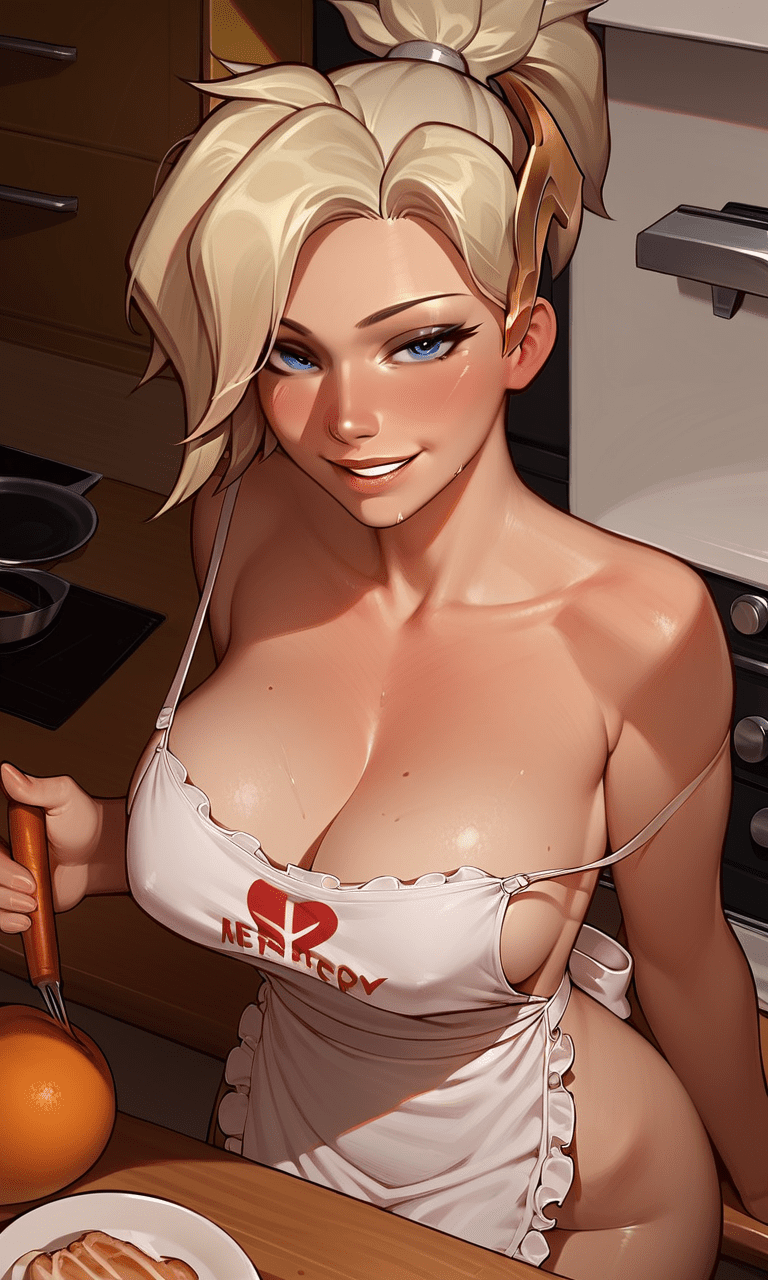 Overwatch Sex Art – apron, strap slip, grin, angela ziegler, large breasts, mercy