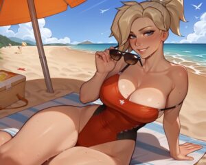 Overwatch Sex Art – sitting, wide hips, blush, aviator sunglasses, mercy, strap slip