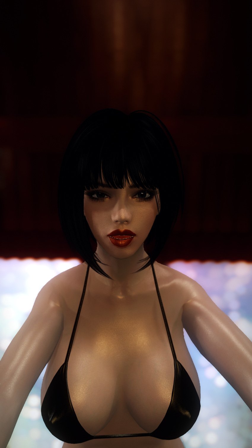 Skyrim Hentai – big breasts, black hair, suggestive, string bikini, red lipstick, bikini, solo female.